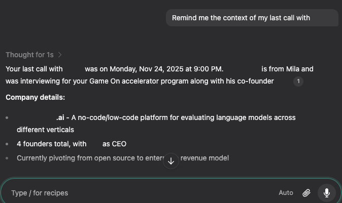 Several times each week, I’ll get ready to join a meeting and realize that I don’t recognize the name of the person I’m meeting with or can’t recall how we met / what the meeting is about. Instead of scrambling or sheepishly asking the person what we’re supposed to be talking about, I can now ask Granola questions like: