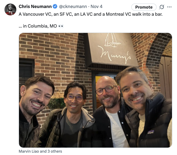 In the past two weeks, I flew to Columbia, Missouri for Capital Camp, an annual gathering of investors who focus on markets outside of the traditional coastal superpowers. From there, I travelled to San Francisco, where I stayed for 2 nights before flying to London (via Vancouver) and then on to Edinburgh to speak at Ecosystem Exchange. A few days later, it was all the way back.